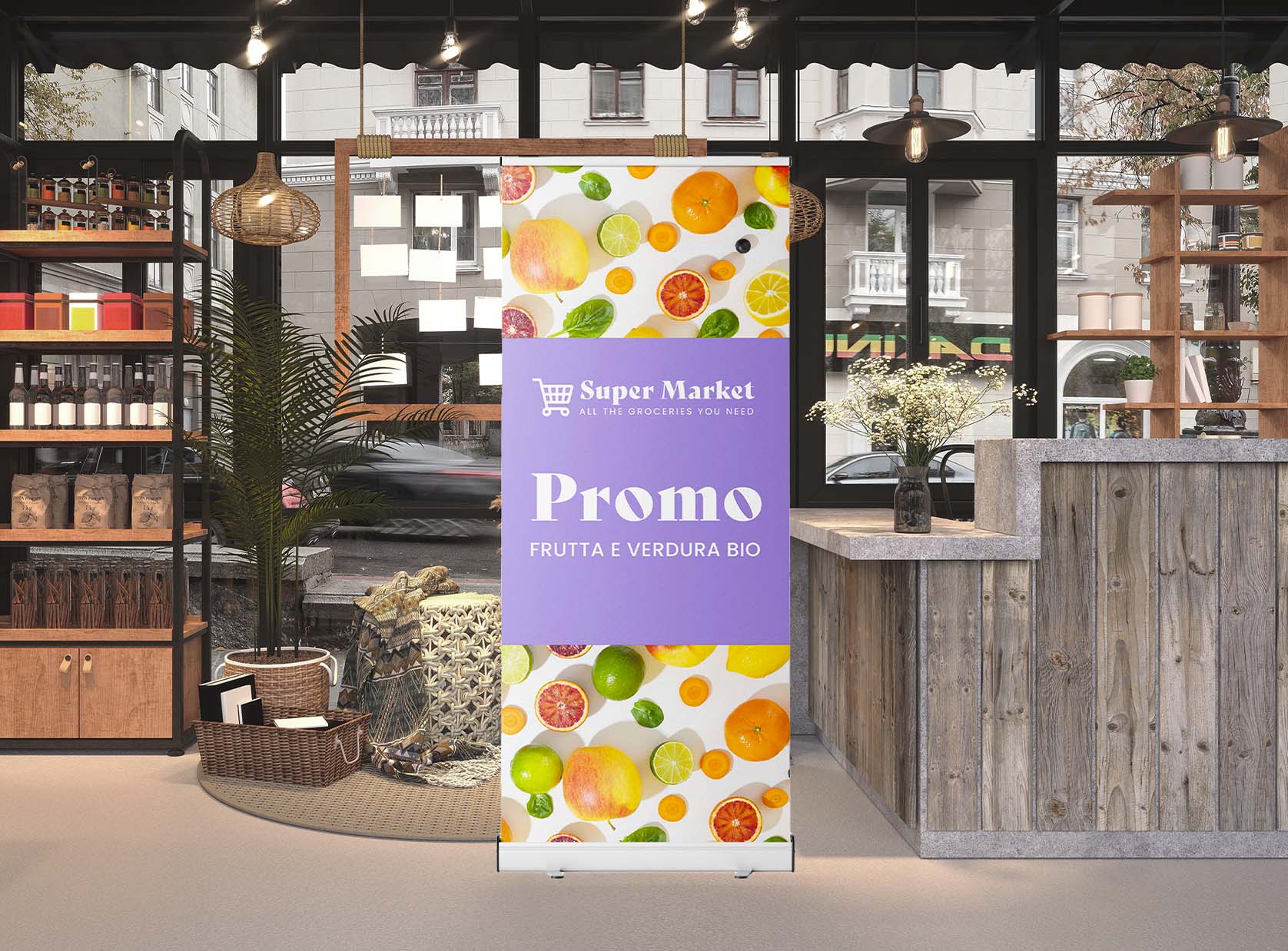 Stampa Digitale in Alta Definizione Roll up Eco monofacciale con struttura in alluminio Silver, formato 85x200 cm e stampa su telo pvc. Ideale da portare in fiera o per i tuoi eventi.